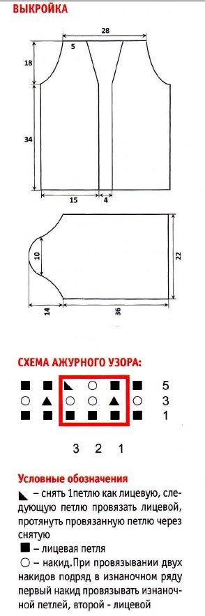 Белый ажурный кардиганРазмер: 122-128 см. Вам потребуется: 500 г пряжи Lanа Gatto Faraone (100% ленпур, 50 г - 70 м) белого цвета - 50 г; пряжи Mondial Surf (100% хлопок, 50 г - 160 м) темно-синего цвета, вязать в 2 нити; спицы №3,5, крючок № 3,75; 7 пуговиц диаметром 1,5 см. Плотность вязания: 25 п. и 21 ряд = 10x10 см, связано ажурным узором. Ажурный узор: вязать по приведенной схеме, на которой указаны только лицевые ряды. В изнаночных рядах вязать по рисунку. Изнаночная гладь: вязать изнаночные петли в лицевых рядах и лицевые петли в изнаночных рядах. Порядок выполнения работ: кофточка вяжется одной деталью до линии проймы. На спицы №3,5 набрать 136 петель, первый изнаночный ряд провязать изнаночными петлями, в следующем лицевом ряду распределить петли таким образом: 1 кром.п., 1 п. изн. глади, далее вязать по схеме ажурного узора, начиная с петель перед раппортом, повторяя 43 раза раппорт узора, закончив петлями после раппорта, 1 п. изн. глади, 1 кром. п. Продолжить вязание установленным образом. На высоте детали 20 см выполнить основу для кармана. Для этого вязать 1 кром. п., 1 п. изн. глади, 4 раппорта узора, закрыть 14 следующих петель, продолжить вязание ажурным узором. На левой передней полочке закрыть петли для кармана симметрично. В изнаночном ряду провязать изнаночные петли в каждую закрытую петлю предыдущего ряда. Продолжить вязание ажурным узором. На высоте детали 34 см разделить вязание на спинку и передние полочки, и одновременно с этим, начать формирование V-образного выреза горловины. Для этого вязать следующим образом: 1 кром. п., 2 петли вместе изнаночной, 30 петель ажурного узора для правой передней полочки, далее присоединить другой клубок и вязать ажурным узором деталь спинки (73 петли), после чего присоединить нить от дополнительного клубка и вязать ажурным узором 29 петель детали левой передней полочки до последних 3 петель, провязать 2 петли вместе изнаночной, 1 кром. п. Далее продолжить вязание спинки. Для формирования проймы сокращать с обеих сторон в каждом 2-м ряду 10 раз по 1 петле. Сокращение петель выполнять на расстоянии 1 петли от кромочной, провязывая 2 петли вместе в начале ряда и простую протяжку (1 петлю снять, следующую провязать лицевой, протянуть снятую петлю через провязанную) в конце ряда. Продолжить вязание ровно. На высоте 18 см от разделения вязания закрыть оставшиеся петли. Общая высота детали 52 см. Передние полочки вязать с аналогичными вырезами для проймы. Для формирования V-образного выреза горловины провязывать в каждом 2-м ряду 2 петли вместе изнаночной в начале ряда для правой полочки и в конце ряда для левой полочки. Выполнив таким образом 14 сокращений с обеих сторон, продолжить вязание ровно. На общей высоте детали 52 см закрыть оставшиеся петли каждого плеча. Рукава: на спицы №3,5 набрать 47 петель и вязать ажурным узором, начиная с 1 кром. п., петель перед раппортом, повторяя 4 раза раппорт узора и заканчивая петлями после раппорта, 1 кром. п. Вязать ровно до высоты детали 36 см, после чего начать формирование оката рукава. Для этого в каждом 2-м ряду сокращать с обеих сторон 10 раз по 1 петле, провязывая на расстоянии 1 петли от кромочной 2 петли вместе лицевой в начале ряда и простую протяжку в конце ряда (1 петлю снять, следующую провязать лицевой, затем протянуть снятую петлю через провязанную). Далее закрыть с обеих сторон в каждом 2-м ряду 2 раза по 5 петель, после чего з