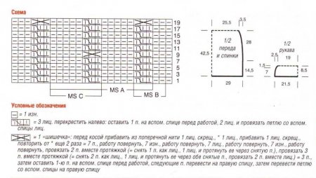 Спинка/перед: набрать 76 (84) 92 п. и связать для планки 1,5 см = 3 р. изн. гладью и 1 изн. р. изн., при этом в последнем р. равномерно прибавить 8 (10) 12 п. = 84 (94) 104 п. Затем вязать основным узором. Через 37.5 см = 96 р. (40 см = 102 р.) 42,5 си = 108 р. от планки закрыть для скосов реглана с обеих сторон 3 п. и в каждом 2-м р. 5 х 1 п. Через 42,5 см = 108 р. (45 см = 114 р.) 47.5 см = 120 р. от планки отложить оставшиеся 68 (78) 88 п.