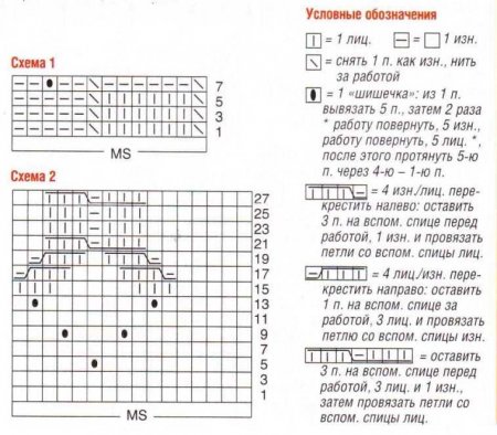 Основной узор: число петель кратно 13 + 4 (1) 11 +2 кром. Вязать по схеме 1, на которой приведены только лиц. р.. в изн. р. петли вязать по рисунку, снятые п. вязать изн., петли «шишечек» вязать лиц. Начинать с 1 кром. и последних 11 (3) 8 п. раппорта, повторять раппорт, заканчивать первыми 6 (11) 3 п. раппорта и 1 кром. Связать 24 (27) 30 раз 1-й + 2-й р. = 48 (54) 60 р., затем повторять с 1-го по 8-й р.