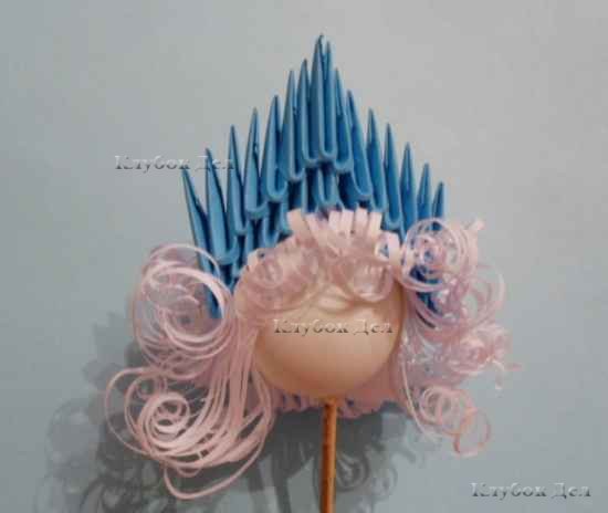 Волосы сделайте из прямоугольников бумаги белого цвета, надрезав ножницами мелкие полоски, но не разрезая их до конца. Надрезанные концы закрутите на зубочистку. Приклейте получившиеся локоны неразрезанным концом вокруг головы по нижнему её краю, не заполняя место, где будет лицо. Затем, приклейте локоны по верхнему краю головы.