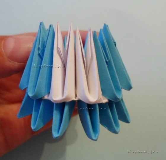 18 ряд – 3 белых, 16 голубых (каждый белый модуль наденьте на 2 уголка, а каждый голубой – на 3 уголка)