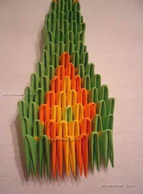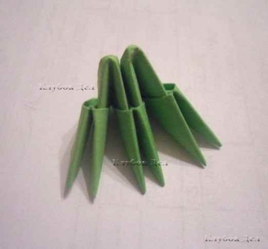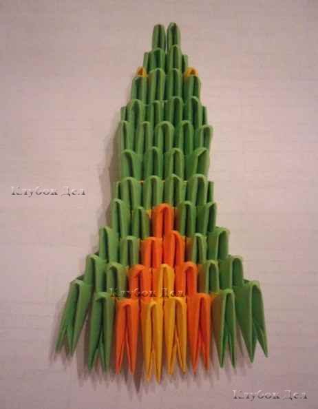 1. Сборка головы. Модули соединяйте по фото ниже, чередуя цвет. Ряды чередуйте начиная с первого ДСН (длинными сторонами наружу), следующий ряд КСН (короткими сторонами наружу) и так до самого хвоста, чтобы брюшко сделать желтым, а спинка осталась зеленой.