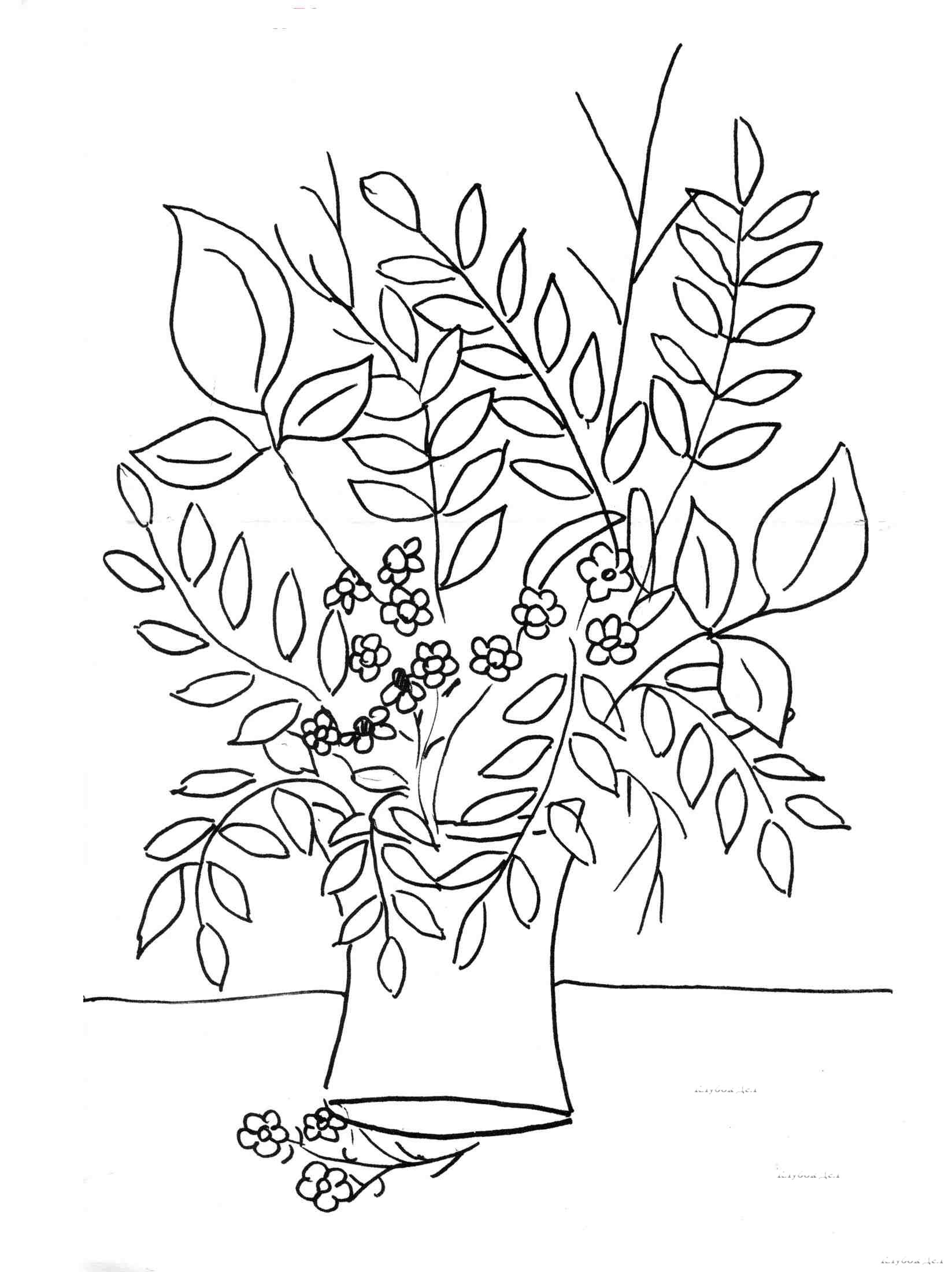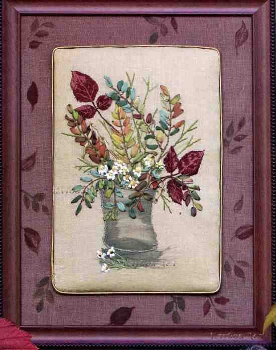 В первую очередь стебельчатым швом мулине в 2 сложения вышейте высокие травинки и прожилки листочков, затем лентами жёлтого цвета прямыми воздушными стежками вышейте сердцевинки ромашек, накладывая стежки один на другой и таким образом увеличивая объём. Бордовые листья малины вышейте гладью мулине в 1 нить. Листья рябины вышивайте в последнюю очередь. Скатерть и контур вазы вышейте швом «вперёд иголку» мулине в 2 сложения.