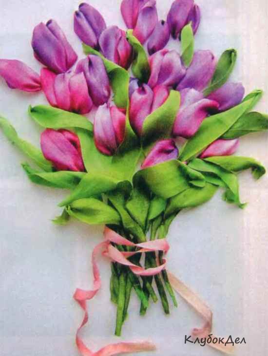 • Ленты шириной 13 мм шелковая (подойдет и 12 мм атласная): сиреневая или любая другая для вышивки тюльпанов и зеленая для вышивки листьев;